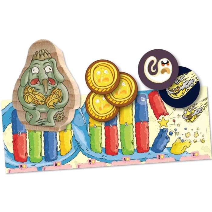 - Un massiccio Totem di legno e… 1 acidissimo Tabellone, 36 gettoni Evoluzione, 6 segnalini Pressione Evolutiva e molto, molto altro!