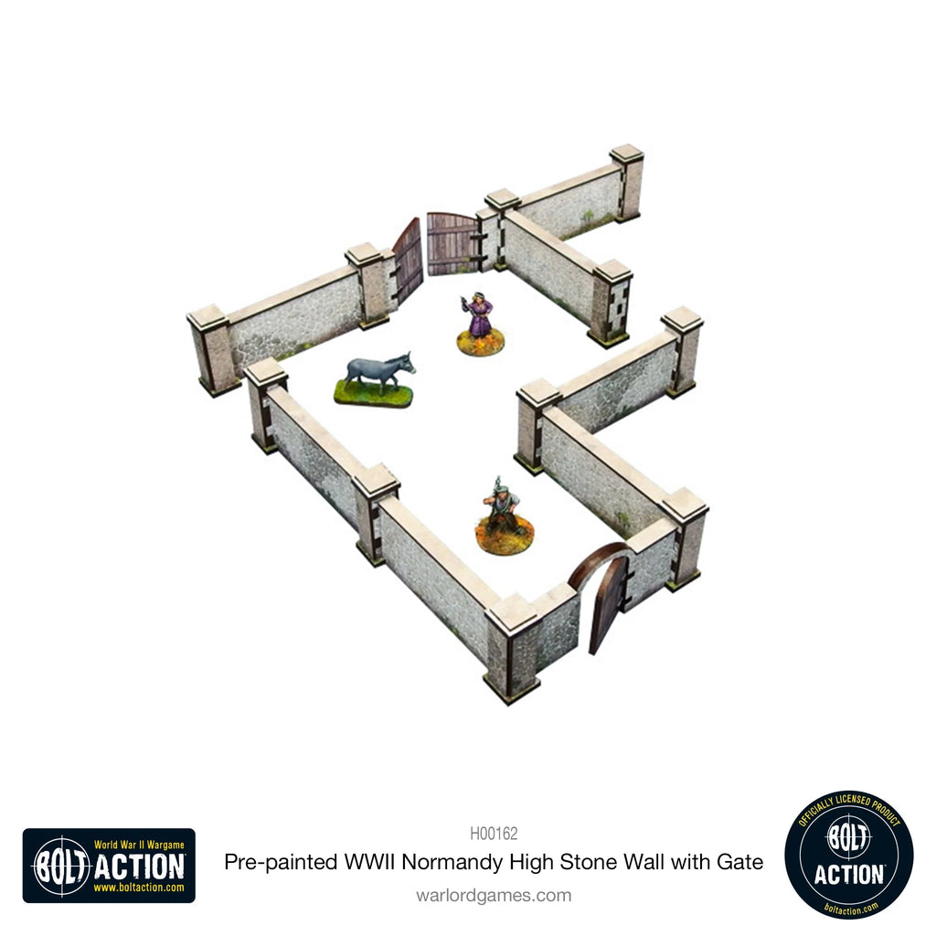 Multicolour pre-painted (UV-printed) modular WW2 Normandy high Stone Wall with Gate terrain. The gate can be opened or closed during play. Infantry full cover and vehicle hard cover, a perfect defensive position.
