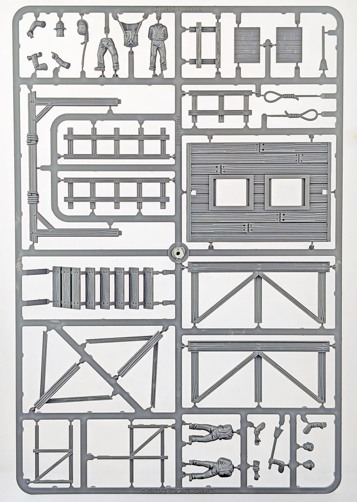 Two condemned souls stand beneath the noose. A stern announcer reads the sentence as the crowd holds its breath. And behind it all, the hangman waits, hand on the lever, eyes fixed on the hour. Plastic model kit. 28mm scale. Includes four multipart 28mm plastic miniatures.