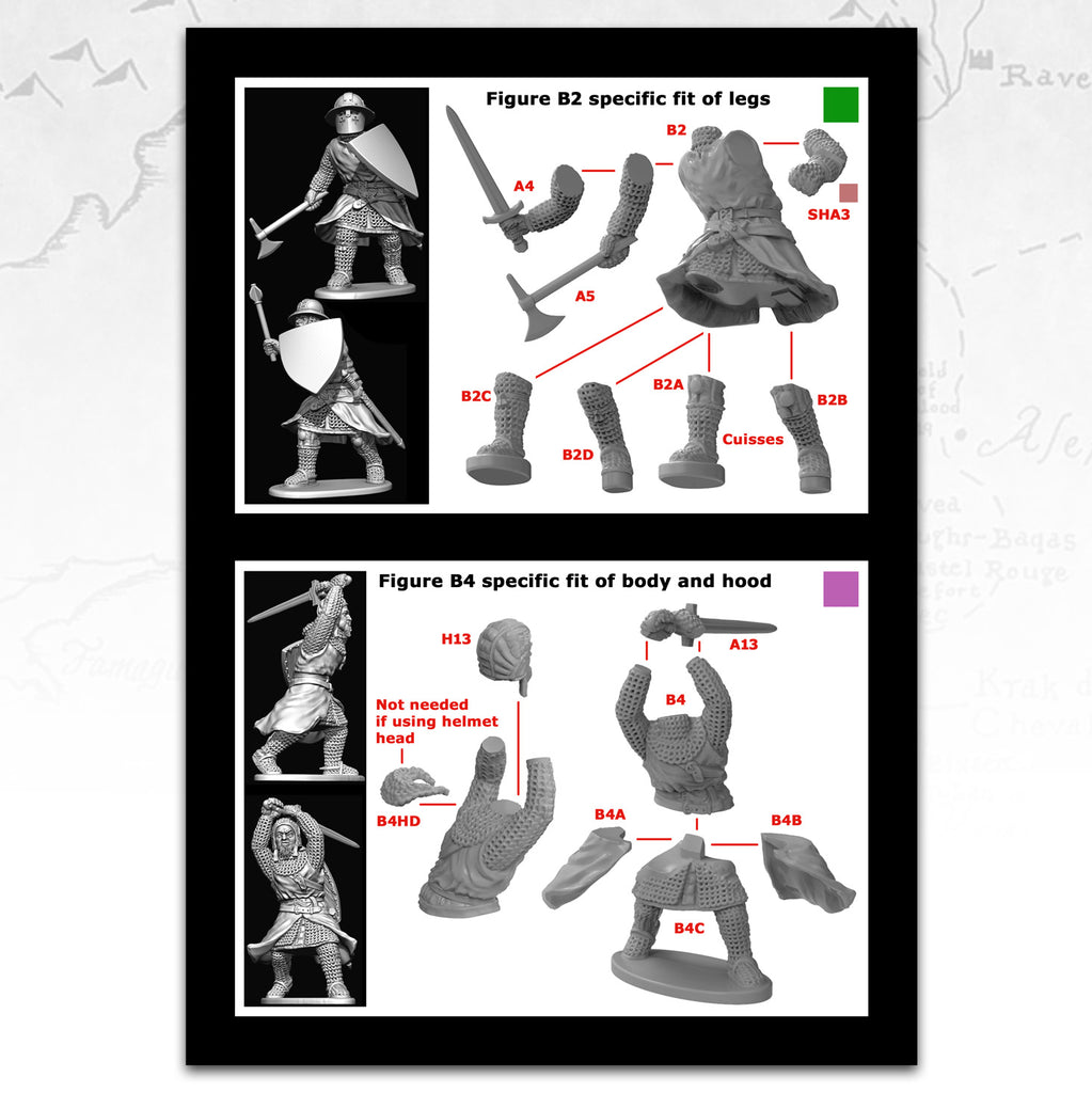 Earlier styles can be used together with later styles as equipment would last generations as it was passed from Father to Son. These can all be interchangeable with our mounted Knights set.