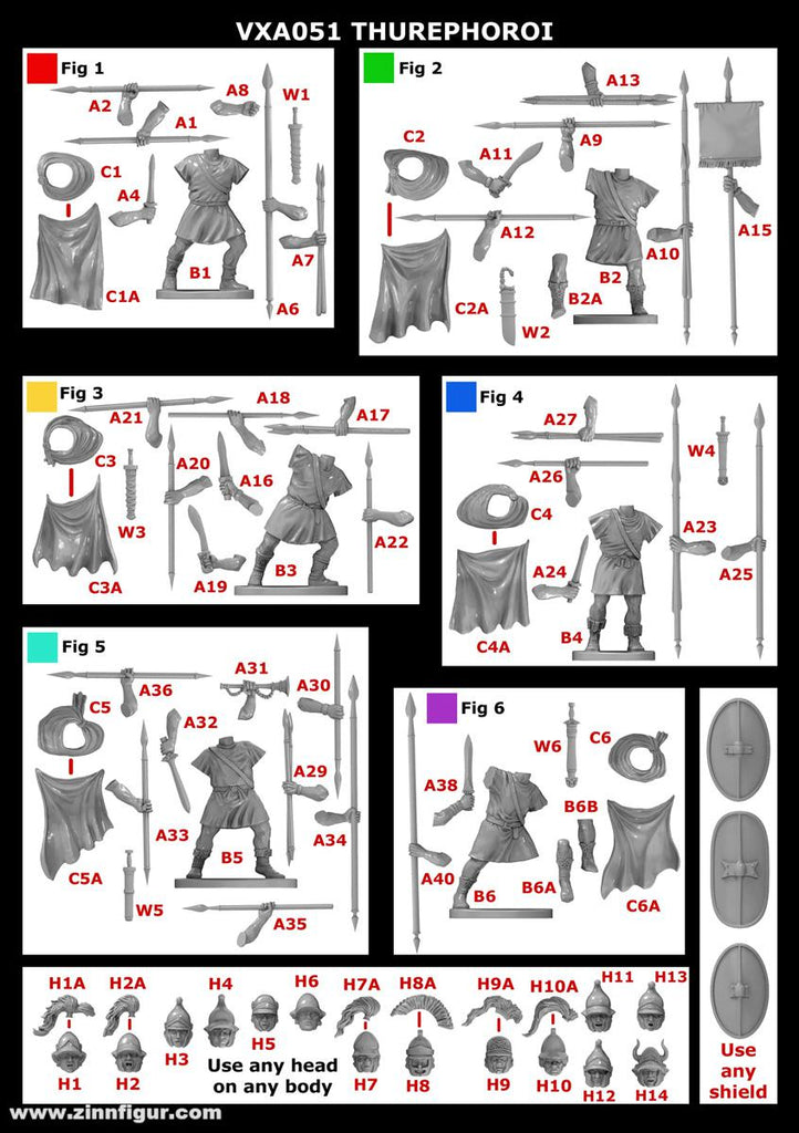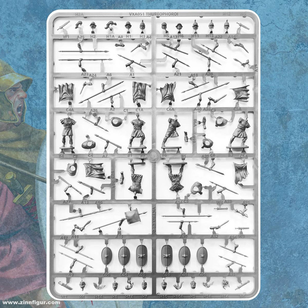 - There are 36 Long thrusting spear options held in the left shield hand, enough for all figures in the set. If you do want to arm your Thurephoroi with thrusting spears in the right hand you can use them from the Greek hoplite set which has plenty of extras.