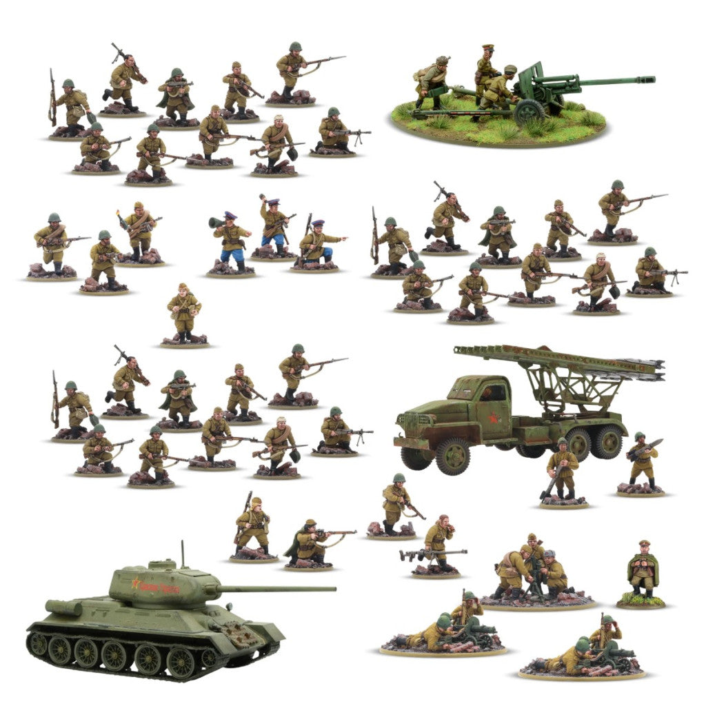 Perfect for representing the great Soviet offensives that helped bring an end to the war in Europe, this starter army gives you everything you need to field a powerful force on the Bolt Action tabletop. At its core is a whopping 42 plastic infantry, enabling you to build a Rifle Platoon packed with a wide variety of infantry squads and weapons teams, as well as all of the Platoon Commanders your force needs. Backing up the infantry is an Artillery Platoon with a ZiS-3 divisional gun, a Heavy Weapons Platoon composed of two Medium Machine Gun teams and a Medium Mortar, with their own Warlord Resin Platoon Commander, plus an Armoured Platoon with a hard-hitting T-34/85 and Katyusha rocket launcher.