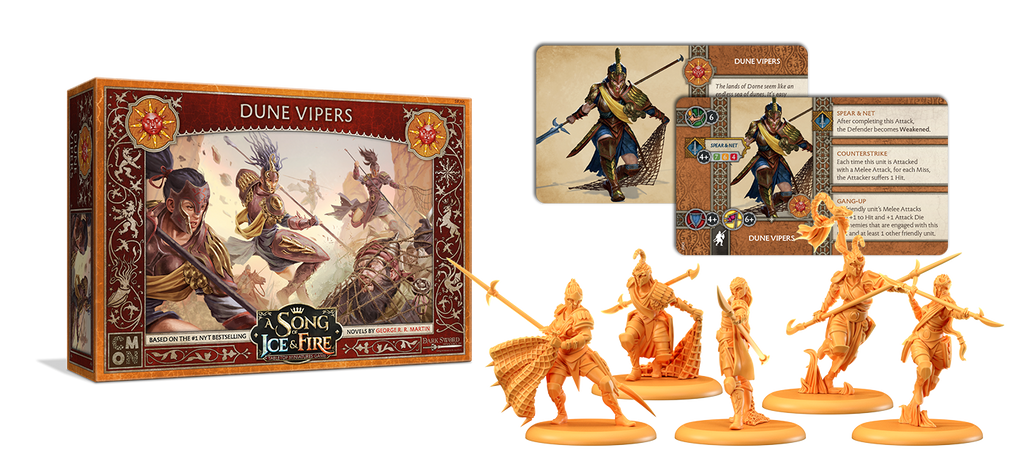 The Dune Vipers Unit Box gives House Martell players in the A Song of Ice and Fire: Tabletop Miniatures Game a crafty melee unit for their forces. They excel in attacking with allies, ganging up to take out extremely strong enemies Their expertise with their spears and nets can bring down the most dangerous of foes with relative ease.
