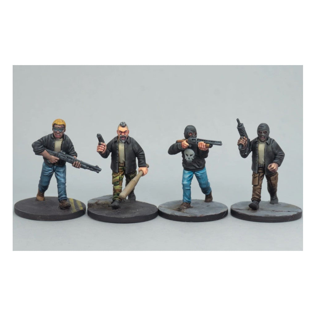 This hard plastic box set includes enough parts to build 24 28mm figures. There are six unique bodies, enough arms to make all of them fleeing, enough arms to have 1/2 the box holding signs, and a huge mix of weapon arms. Weapon arms include: broken bottles, baseball bats, cricket bats, machetes, double barreled shotguns, semi-auto shotguns, pump shotguns, AR-15s, automatic pistols and revolvers, Uzis, and hunting/sniper rifles. And to top it off there are 55 unique heads with a total of 220 heads in the box!